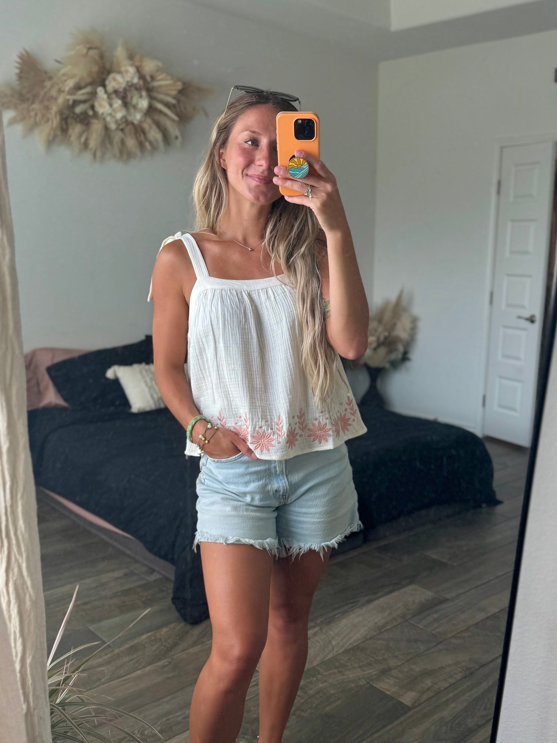 This Desert Blooms Tank is a breezy summer dream. Tie straps, floral embroidery, and hip-length hem make a perfect pair with your favorite denim shorts.